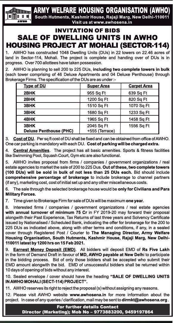 1. The higher Management of AWHO has decided to reduce the sale price of DUs in Mohali (Sect-114) project from Rs 3200/- per sq ft to Rs 3050/- per sq ft with immediate effect. The revised rates will be applicable for Defence Personnel (serving/ retired/ widows & parents of un-married battle fatal casualty pers) only. However, the sale price for other applicants will remain Rs 3200/- per sq ft.