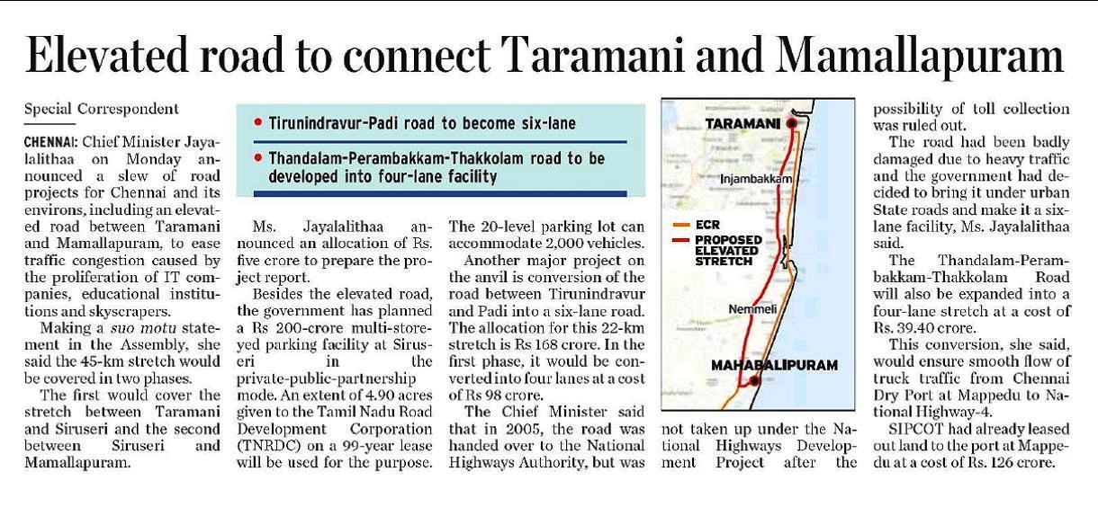 Case for exemption of stamp duty (6%) and registration charges (1%) has been taken up with TN State Government.ELEVATED ROAD TO CONNECT TARAMANI AND MAMALLAPURAM