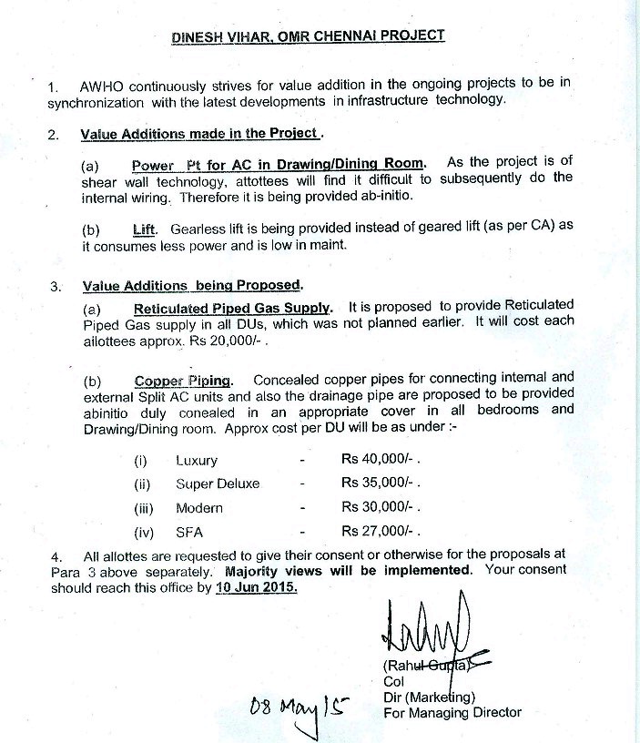 4. Since the title of AWHO Chennai land is clear, Registration Department has been approached to recommence registration process for our project. Once that materialises, flat owners shall be informed accordingly through AWHO website.