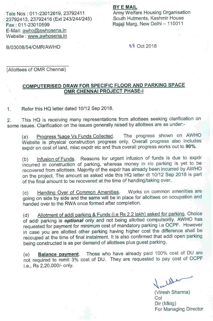 2. Post approval from Board of Governors firm commitment of dates have been obtained from the contractor through MoU, which were intimated to allottees through web update dt 17 Aug 20. Infusion of funds by AWHO to speed up the project for earliest completion has commenced.